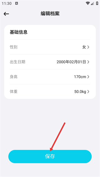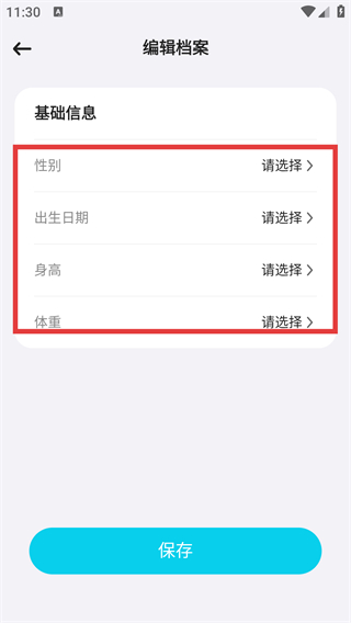 2、在編輯檔案頁(yè)面,依次選擇并填寫【性別-出生日期-身高-體重】等基礎(chǔ)信息項(xiàng)。
