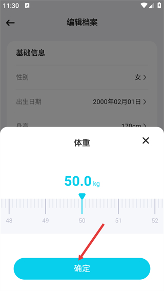 3、填寫體重時(shí),在彈出的體重選擇彈窗中,選定目標(biāo)數(shù)值(如50.0kg),點(diǎn)擊【確定】按鈕確認(rèn)選擇。