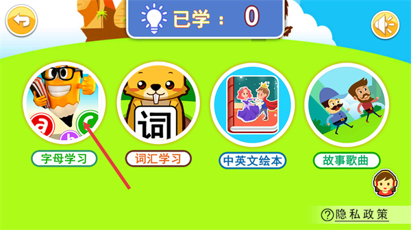 2、在主界面的功能選項(xiàng)中,選擇【字母學(xué)習(xí)】功能入口,進(jìn)入字母學(xué)習(xí)的具體內(nèi)容展示頁面。