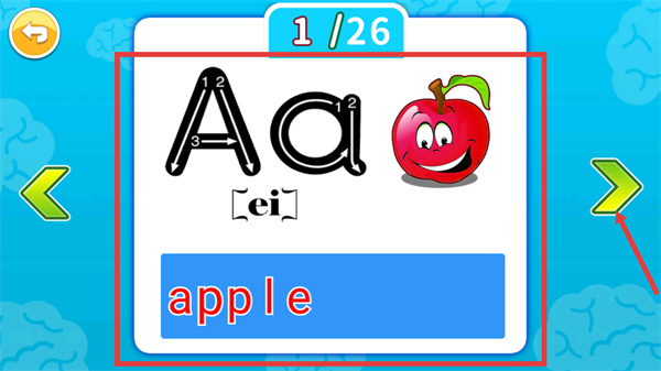 3、進(jìn)入字母學(xué)習(xí)頁面后,可查看字母“A”的書寫筆順、發(fā)音及對(duì)應(yīng)單詞“apple”的內(nèi)容,點(diǎn)擊右側(cè)箭頭可切換學(xué)習(xí)其他字母。