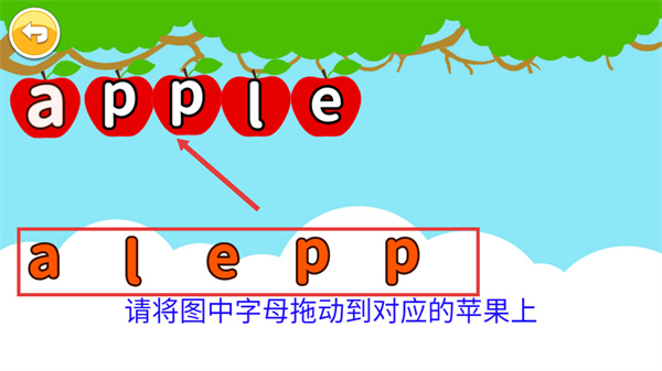 4、進(jìn)入字母拼寫互動(dòng)環(huán)節(jié),按照提示將下方的字母拖動(dòng)到對(duì)應(yīng)的位置,完成“apple”單詞的拼寫練習(xí)。