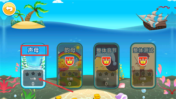 2、在模塊選擇界面,點擊【聲母】模塊開始學(xué)習(xí),初始分?jǐn)?shù)為【0】,完成練習(xí)可積累分?jǐn)?shù)解鎖內(nèi)容。