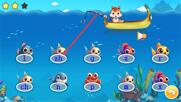3、根據(jù)語音提示識別對應(yīng)的拼音元素,操控界面完成釣魚動作,獲取正確搭配組合。