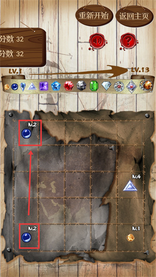 2、將同等級的【lv.2】寶石移動合并,可升級為更高等級的寶石,同時積累分數(shù)提升關(guān)卡進度。