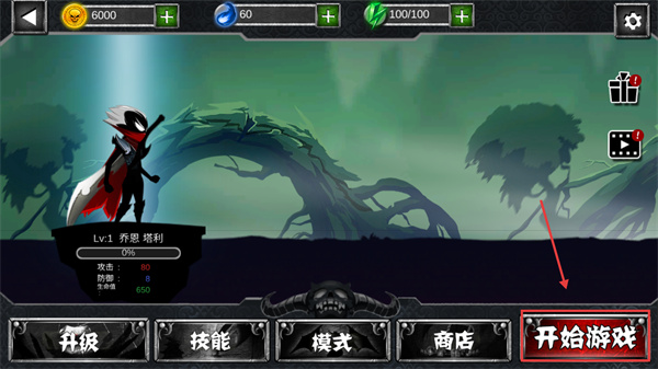 1、查看【Lv:1-喬恩塔利】的屬性面板,確認(rèn)【攻擊-80】【防御-8】等初始數(shù)值后,點(diǎn)擊【開始游戲】進(jìn)入關(guān)卡。