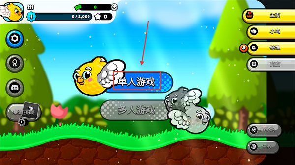 1、進(jìn)入界面后,點(diǎn)擊【單人游戲】可開啟單人關(guān)卡,界面還包含【主頁】【小鳥】等功能入口,后續(xù)可解鎖體驗(yàn)。